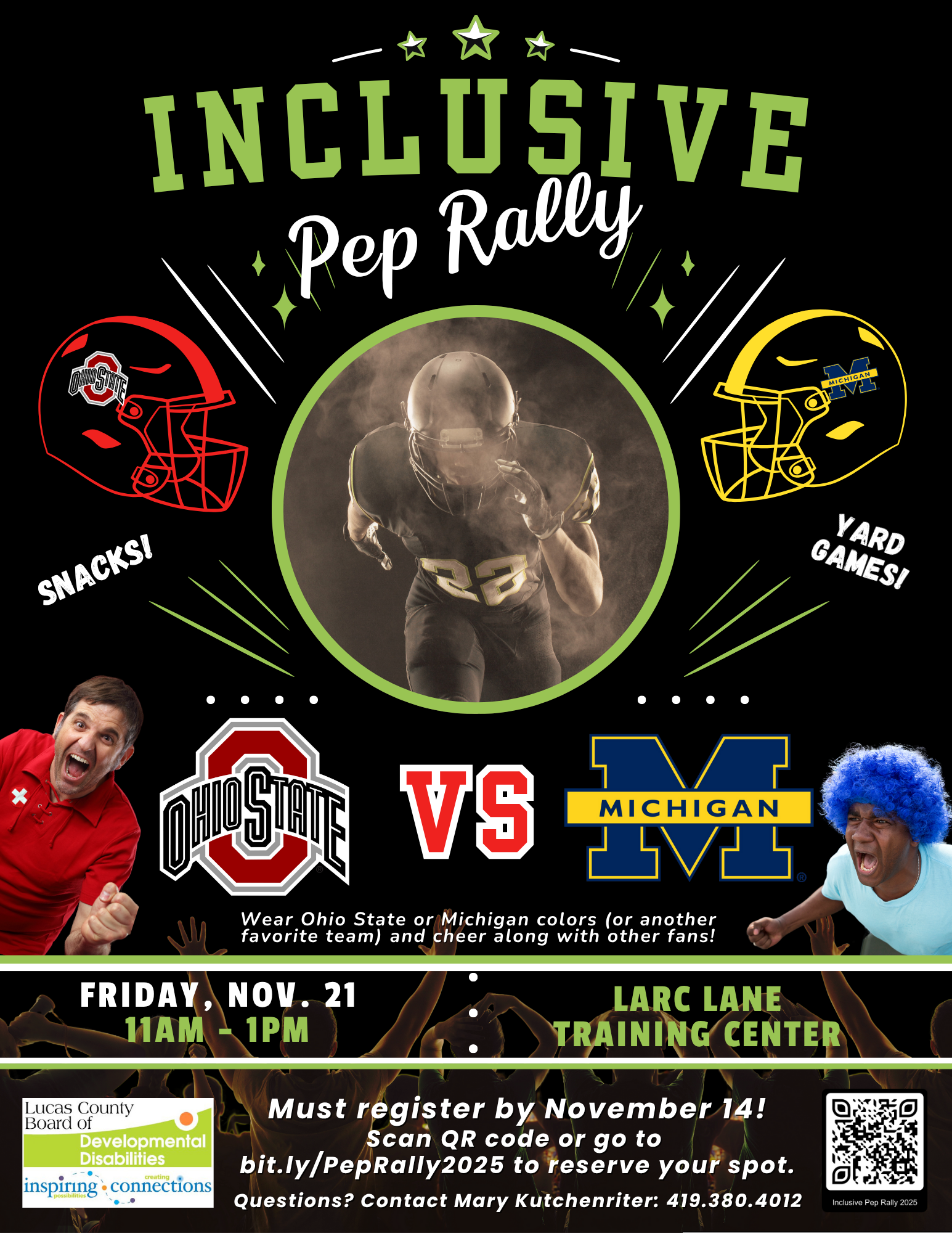 It’s time for our Annual Inclusive Pep Rally & Tailgate Party! Join us on Friday, November 21, from 11 a.m. to 1 p.m. for a celebration packed with food, fun, and team spirit. This event is free, fun, and for everyone—no sidelines here!