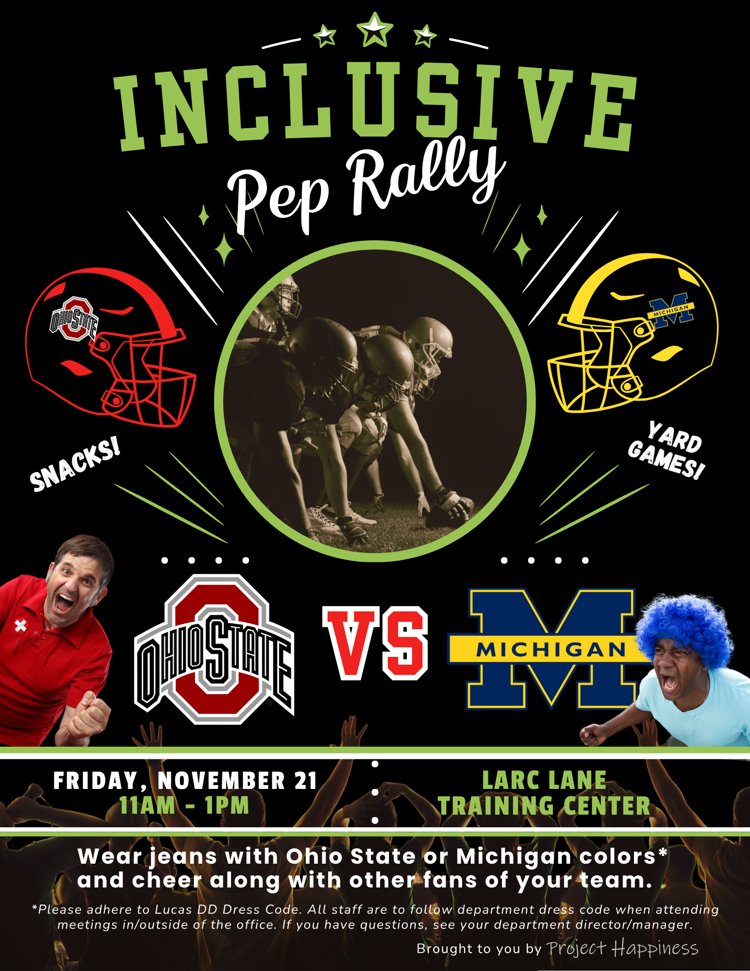 It’s time for our Annual Inclusive Pep Rally & Tailgate Party! Join us on Friday, November 21, from 11 a.m. to 1 p.m. for a celebration packed with food, fun, and team spirit.