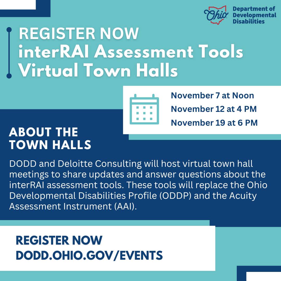 DODD invites you to register for an upcoming virtual town hall to learn about waiver improvements and the new interRAI assessment tool. The interRAI will replace the Ohio Developmental Disabilities Profile and the Acuity Assessment Instrument.