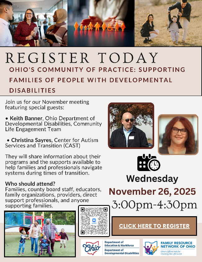 Join the Ohio Community of Practice: Supporting Families of People with Developmental Disabilities on Wednesday, November 26th, from 3:00–4:30 PM.