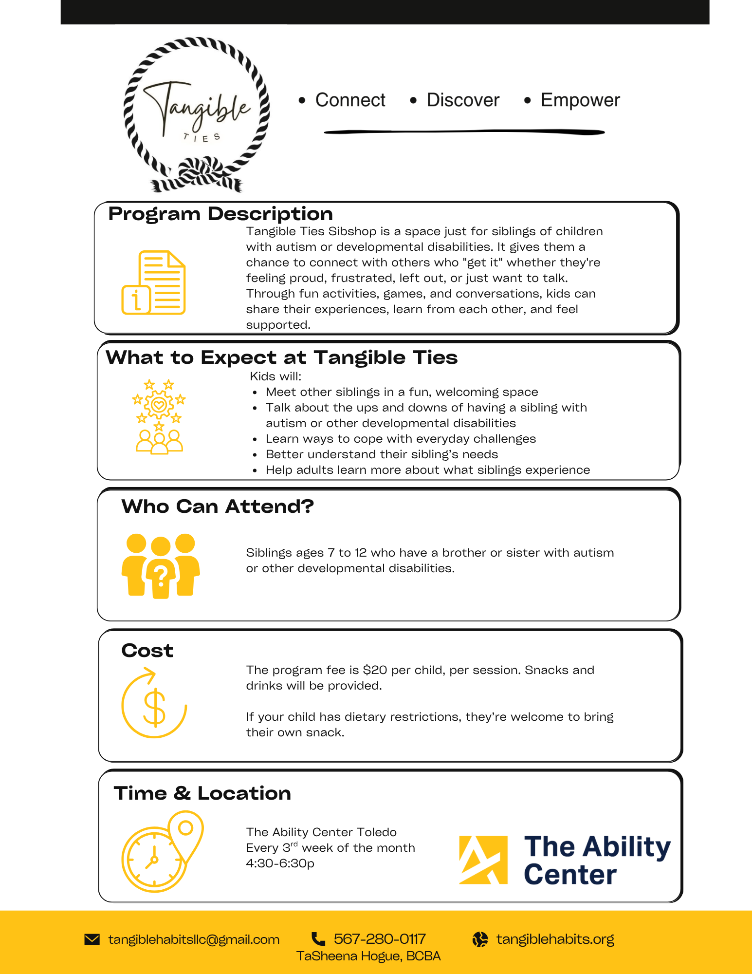Tangible Ties Sibshop is a monthly gathering created to celebrate, support, and empower siblings of individuals with unique needs. This welcoming space provides opportunities for siblings, ages 7-12 years old, to connect with peers who truly understand their experiences, share stories, and participate in engaging activities designed just for them. Through a mix of fun, education, and peer support, participants gain new coping strategies, build lasting friendships, and feel recognized for the important role they play in their families.