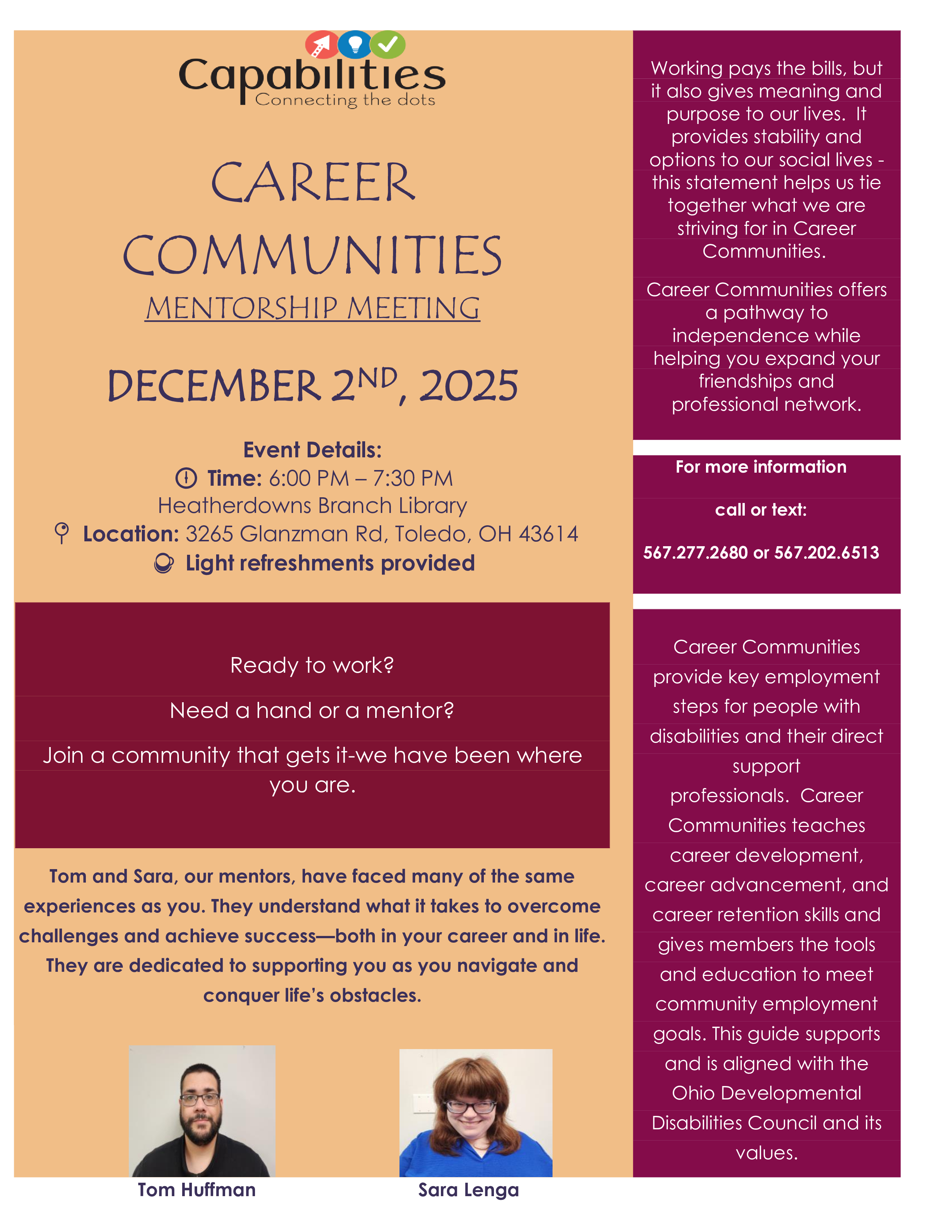 Career Communities is a locally focused, advocate-driven program that uses peer support and motivation to help people reach their employment goals. Attend a mentorship meeting and meet Sara and Tom, who developed a curriculum to share with those who are interested in growing their skills and confidence. Light refreshments will be served!