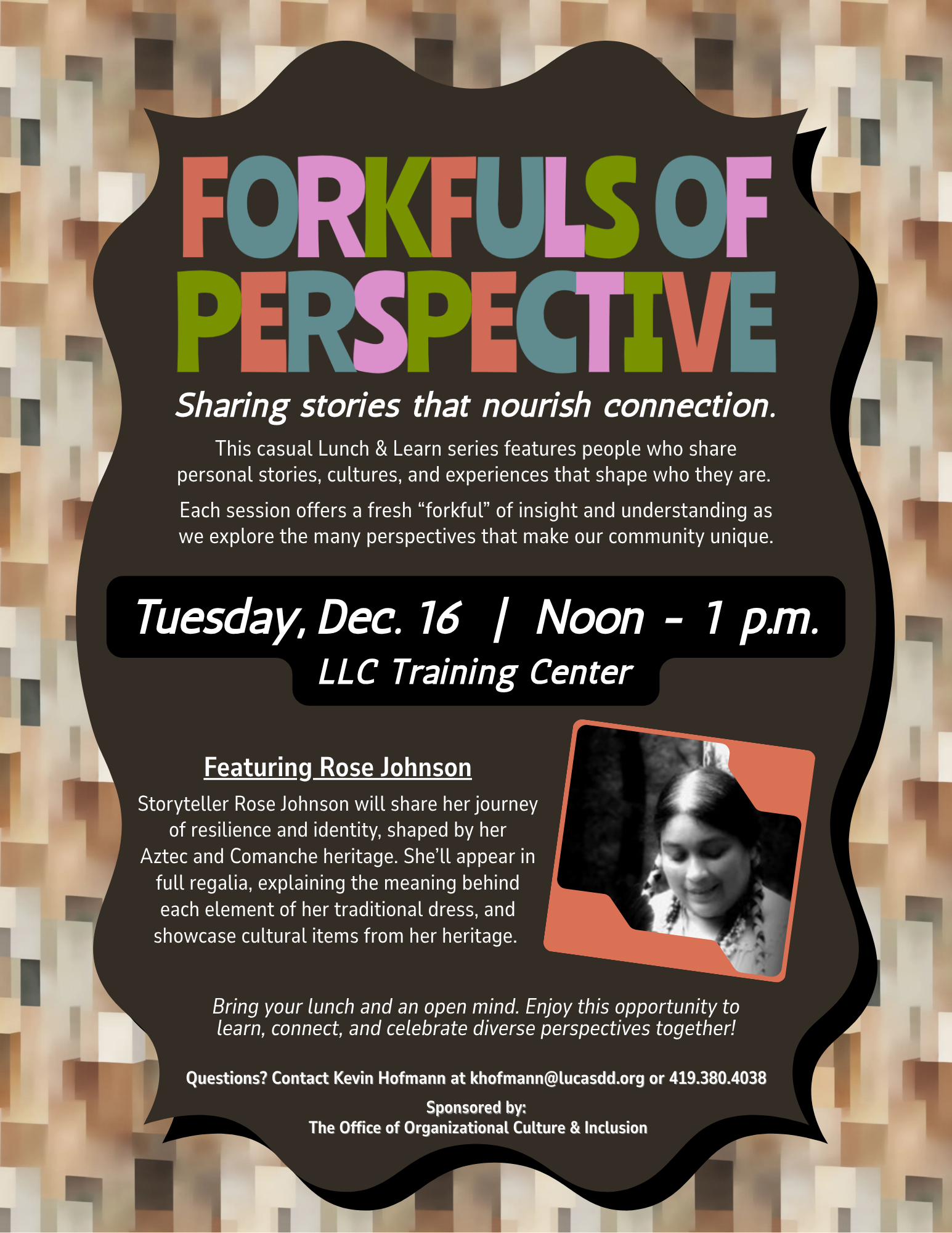 Bring your lunch and join us for a Lunch & Learn with Rose Johnson, a storyteller of resilience and heritage. Hear her powerful journey, explore her Aztec and Comanche roots, and see the meaning behind her traditional regalia and cultural items.