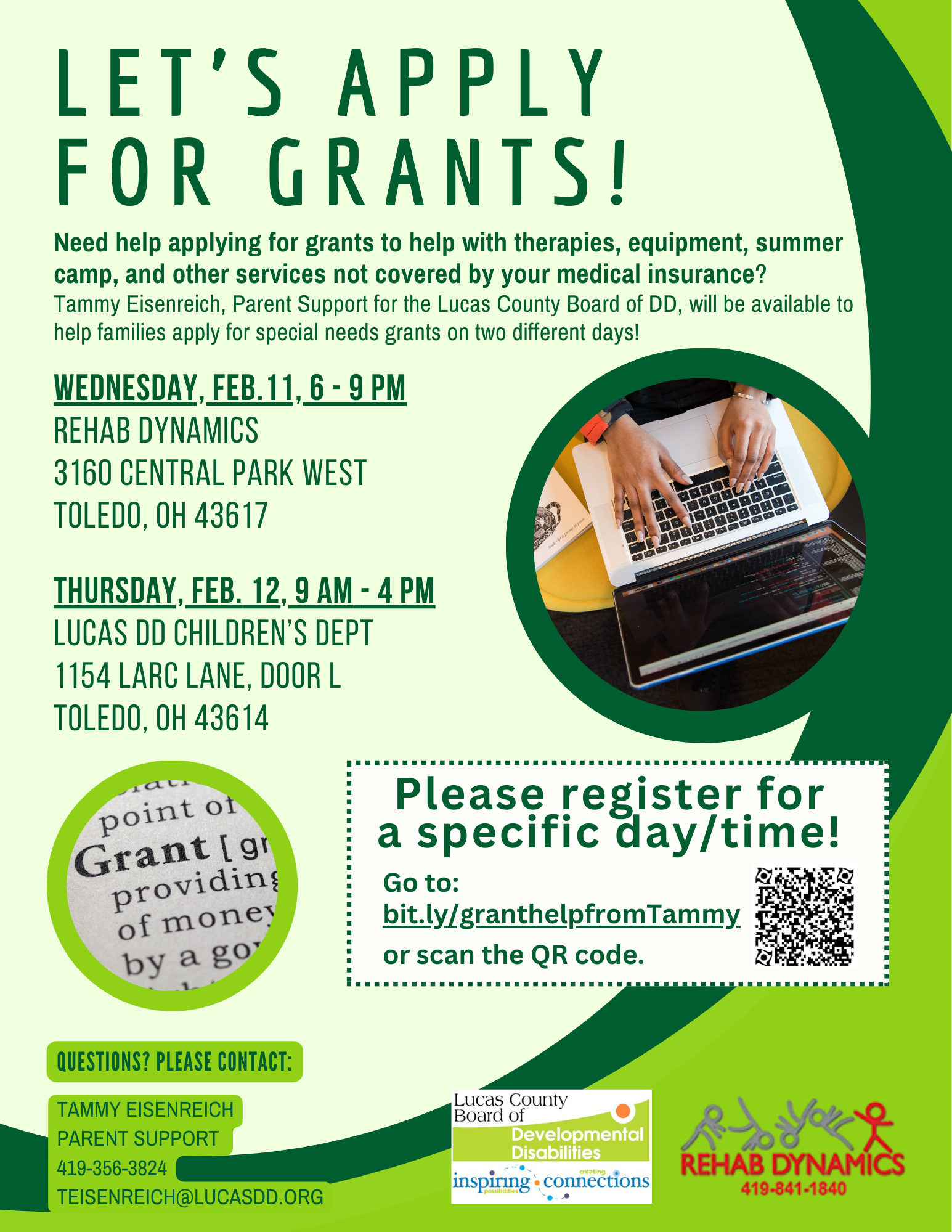 Tammy Eisenreich, Parent Support with the Lucas County Board of Developmental Disabilities, will be available to work one-on-one with families and provide guidance through the special needs grant application process. Families are welcome to attend on one of two available days to get support, ask questions, and take the next steps toward funding.