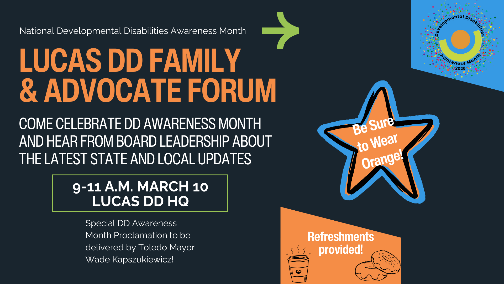 Join us for a special DD Awareness Month celebration edition of the Family & Advocate Forum! Rock your best orange attire and come celebrate the month with us. Enjoy some morning coffee, juices, and sweets, reconnect with old friends, and hear the latest state and local updates from Board Leadership! Toledo Mayor Wade Kapszukiewicz will kick off the meeting with a special proclamation recognizing National Developmental Disabilities Awareness Month 2026 in the City of Toledo.