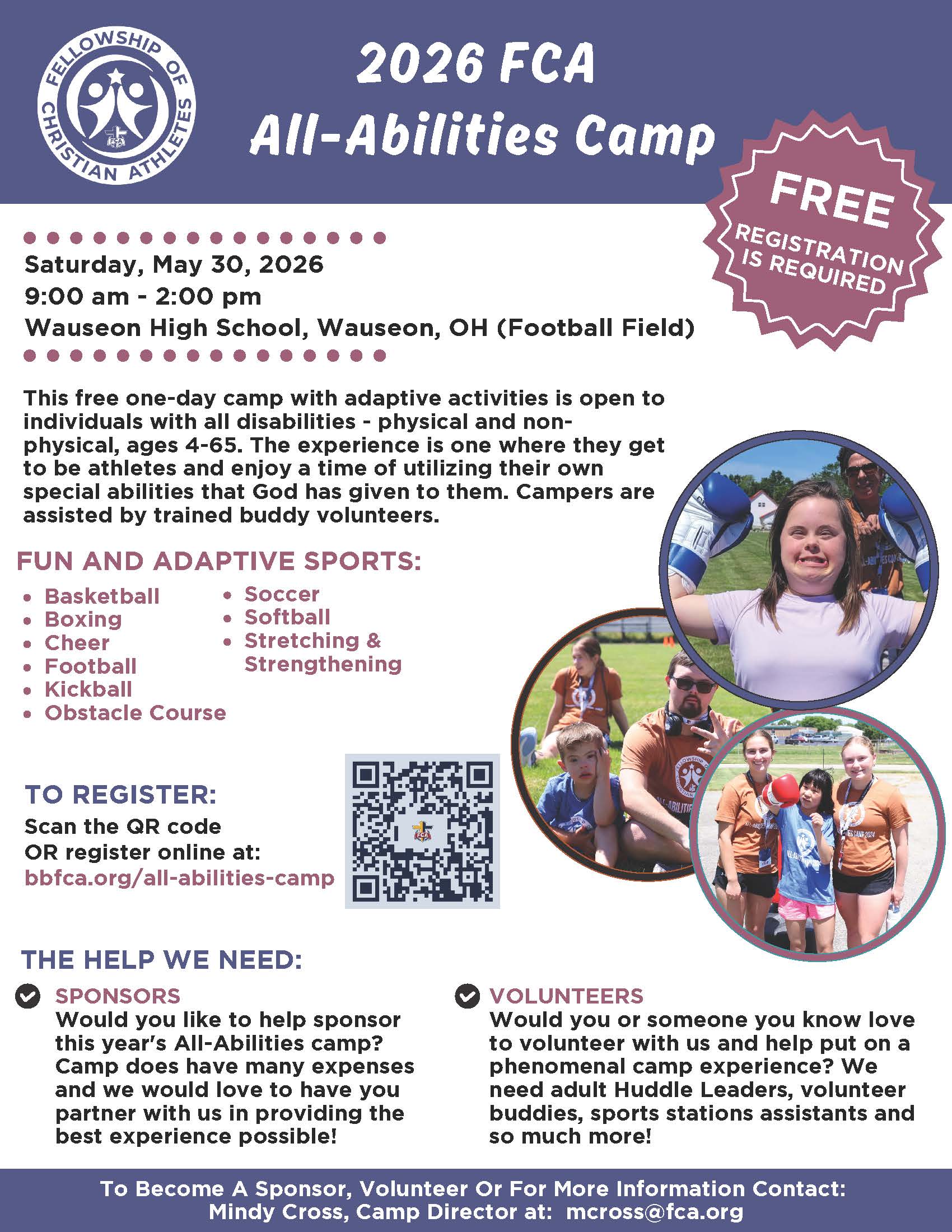 Sponors: Would you like to help sponsor this year's All-Abilities camp? Camp does have many expenses and FCA would love to have a partner(s) in providing the best experience possible!
